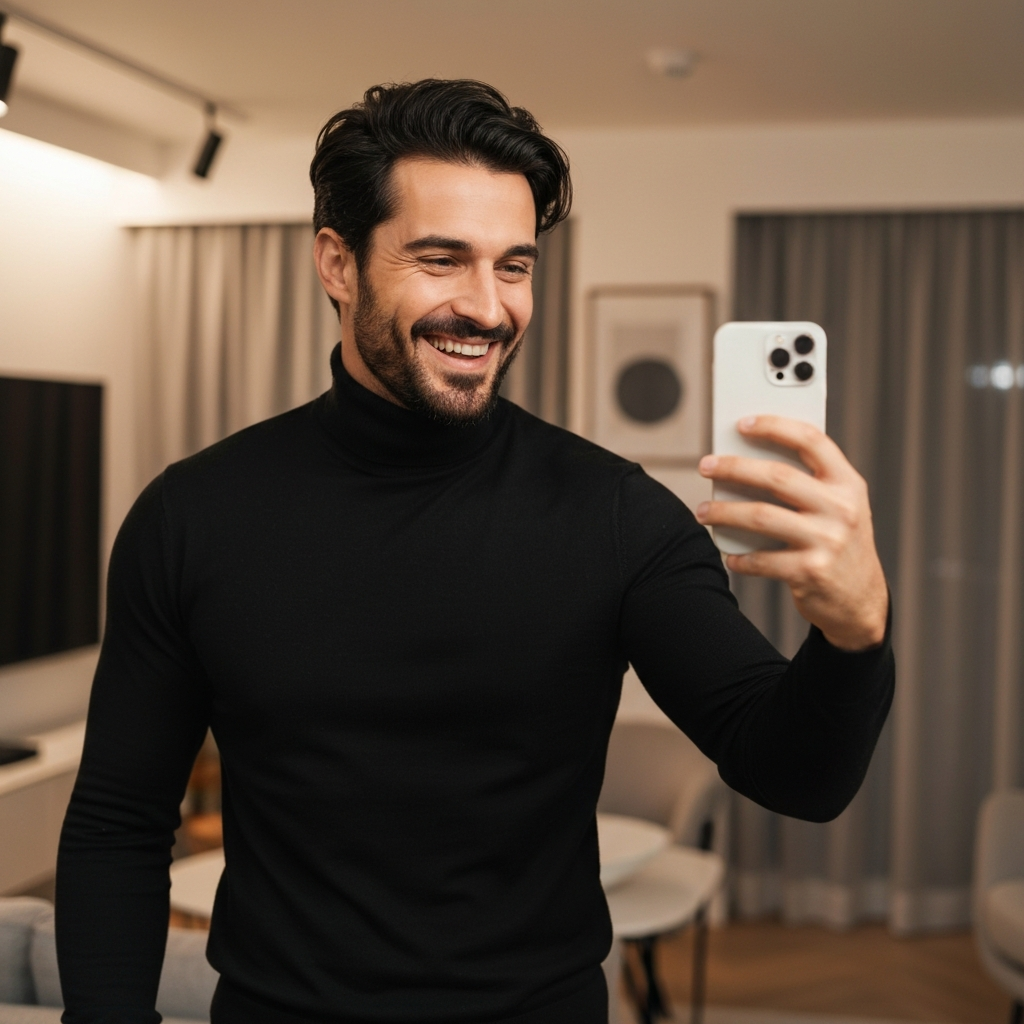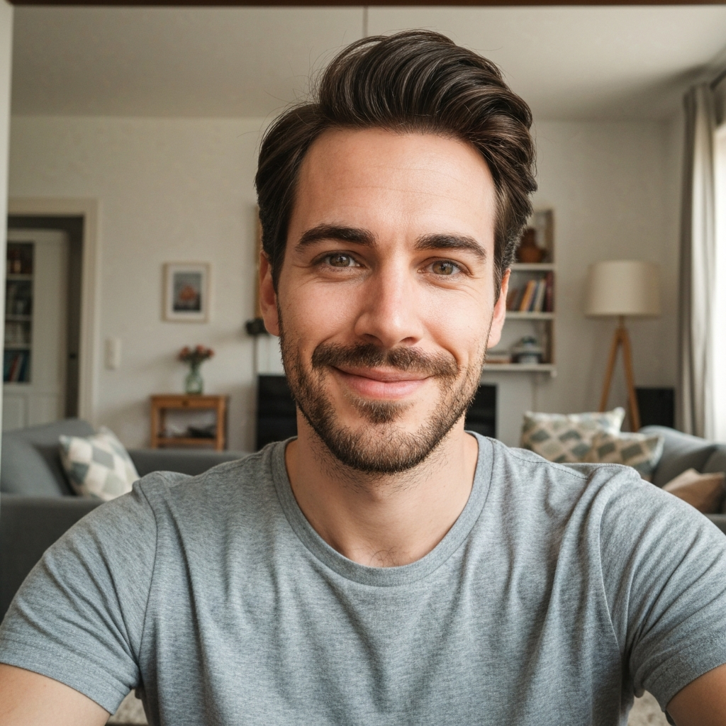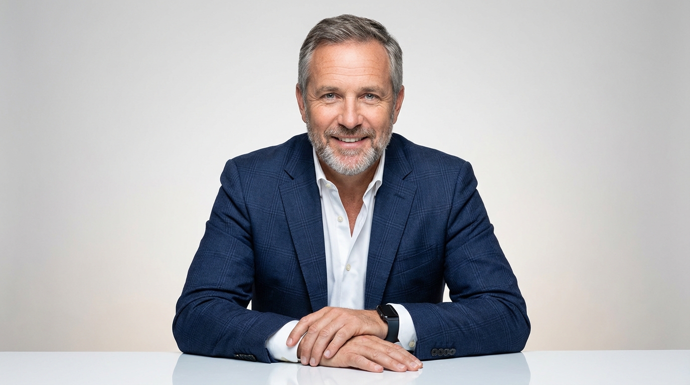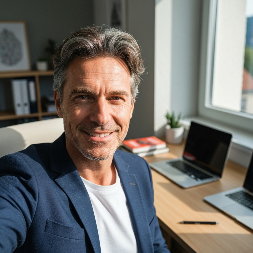Confident posture, warm smile. Naturally puts people at ease on camera.