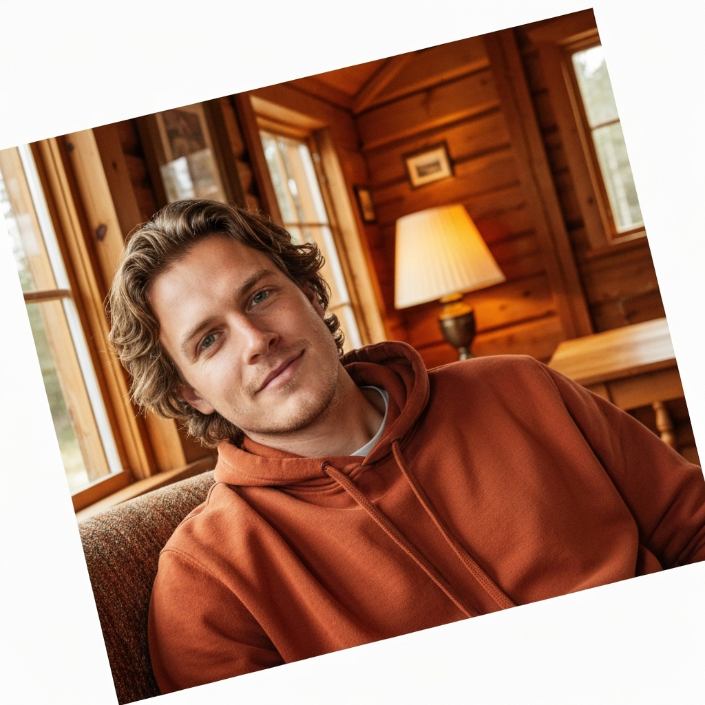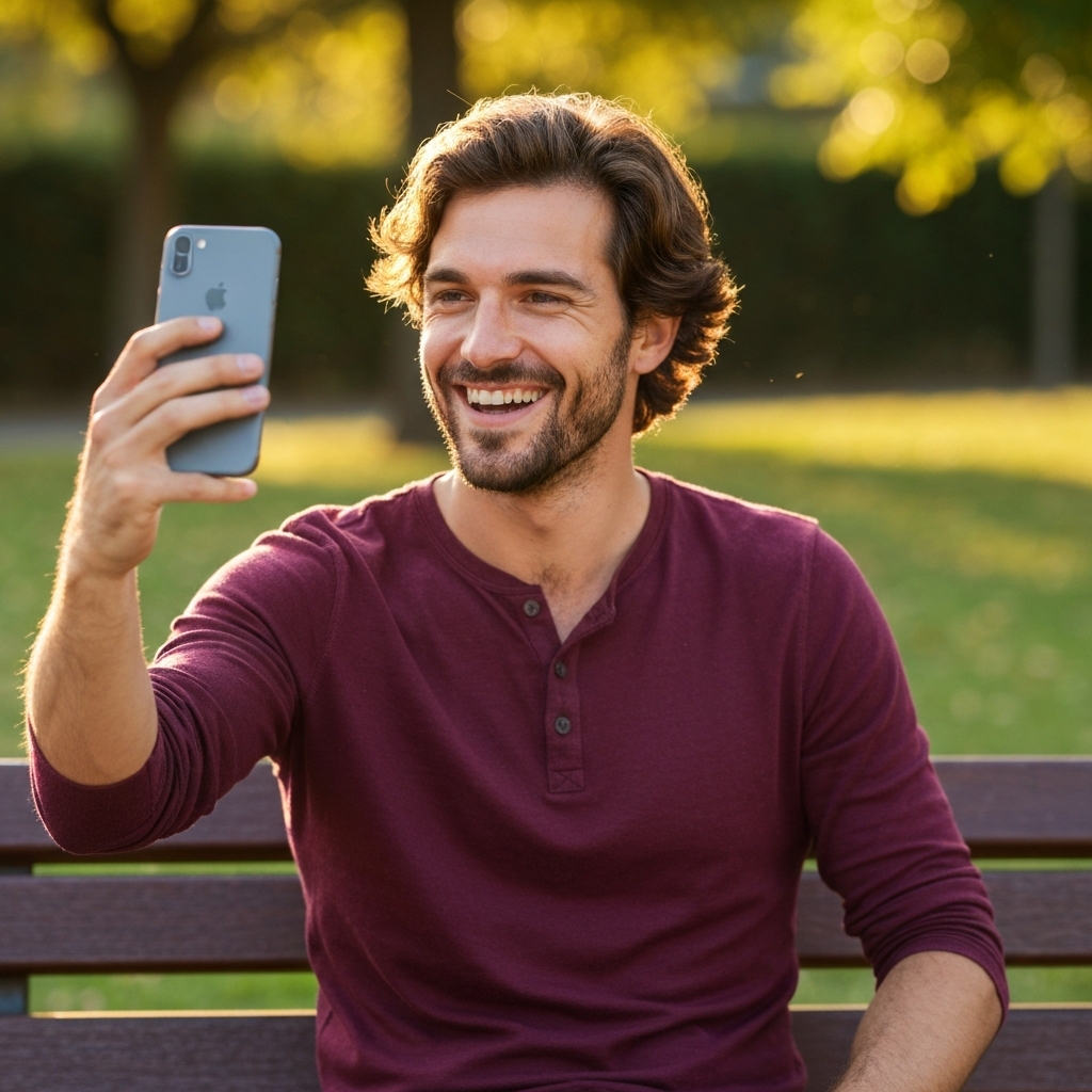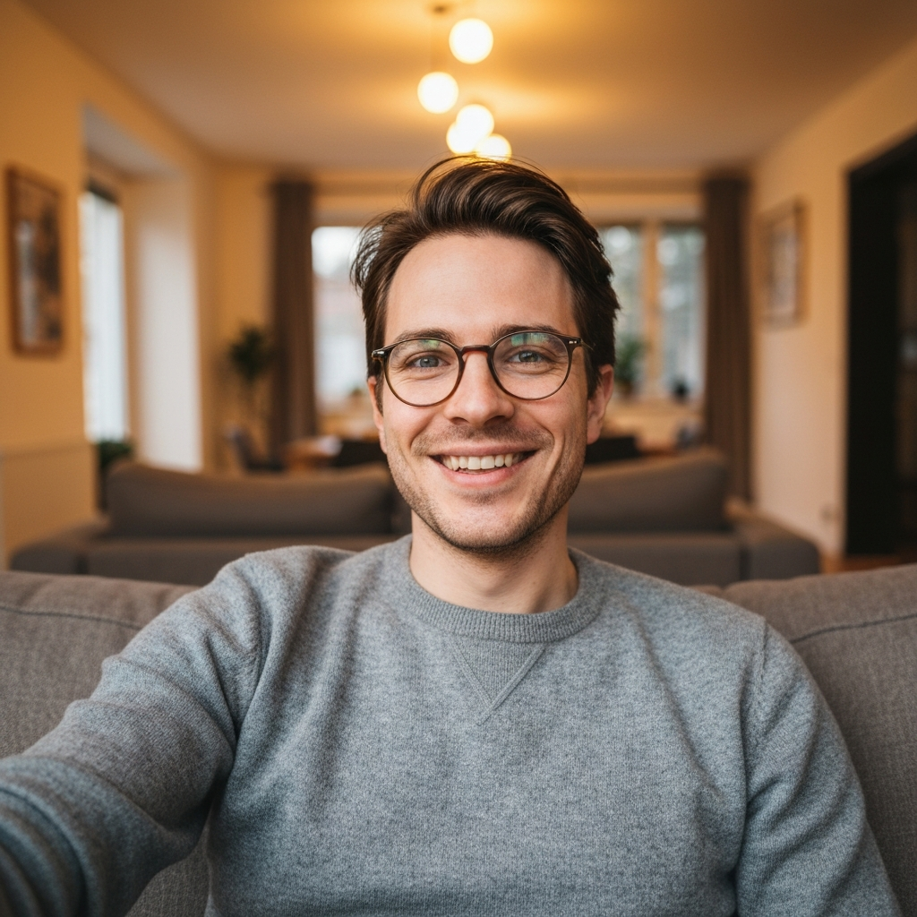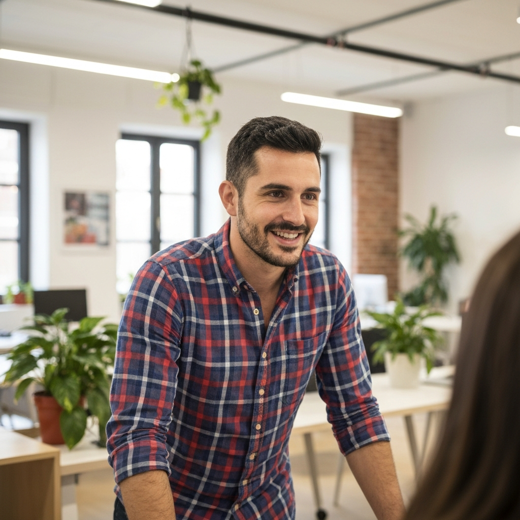 Confident posture, warm smile. Naturally puts people at ease on camera.
