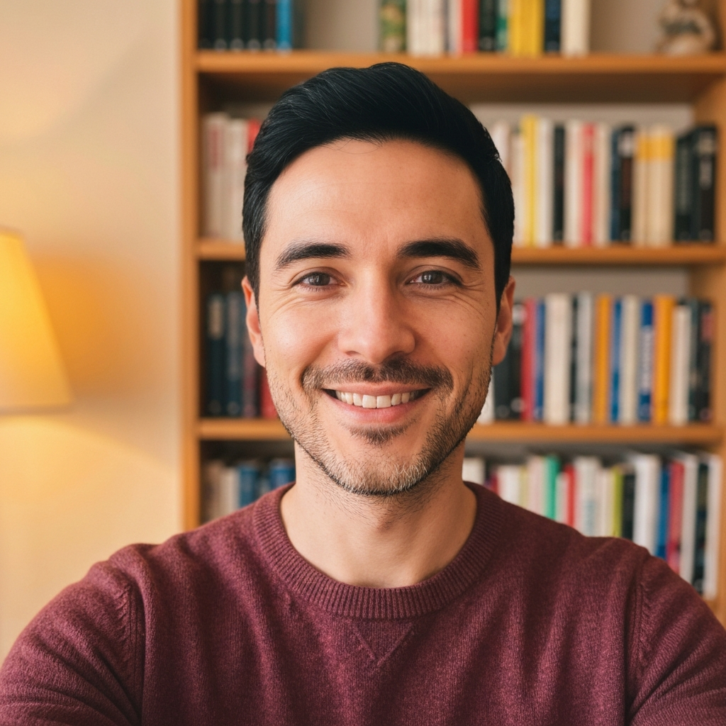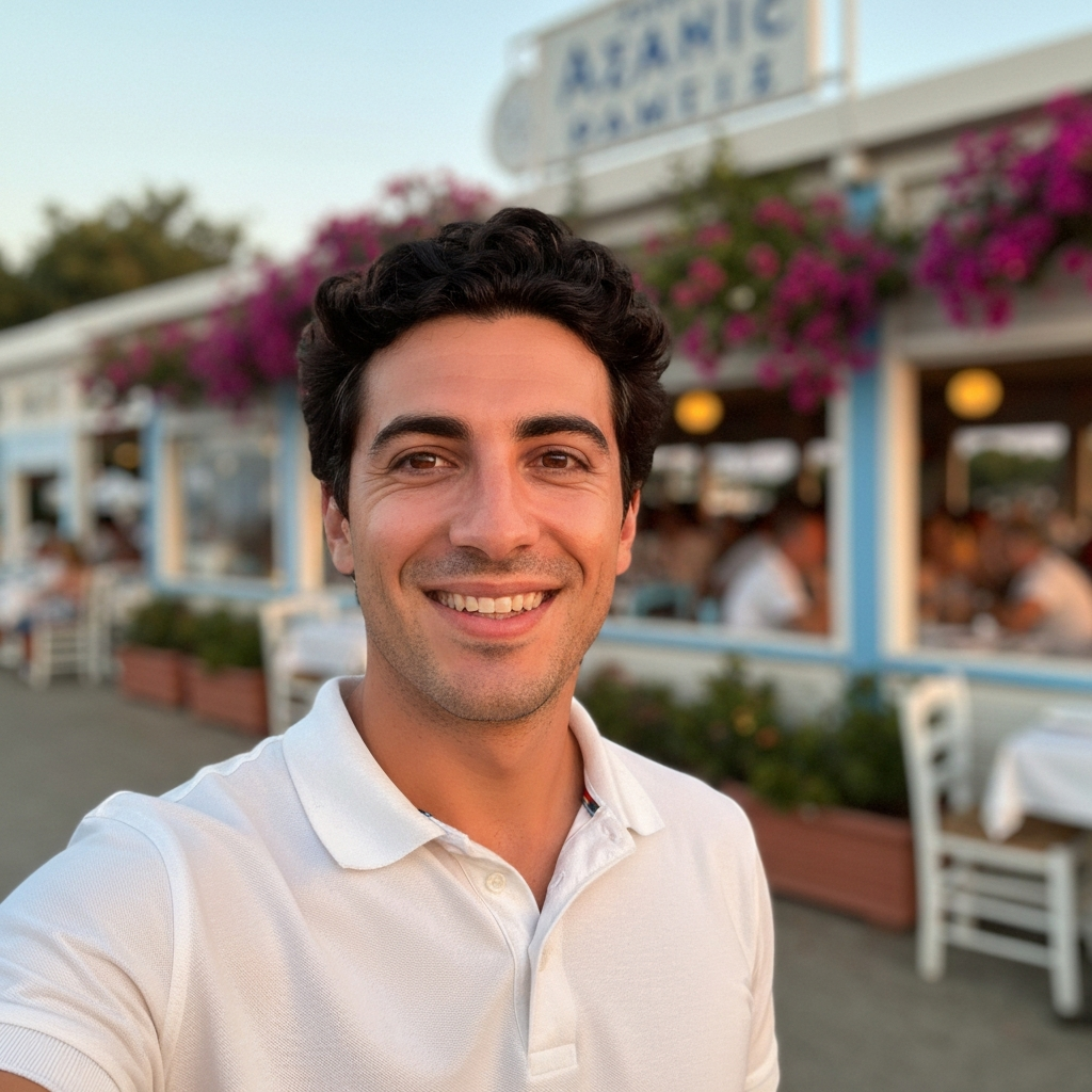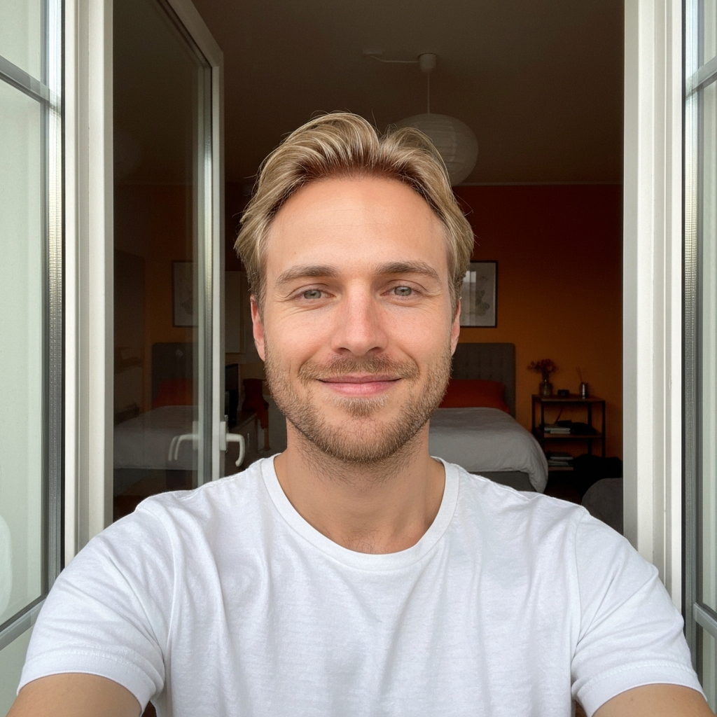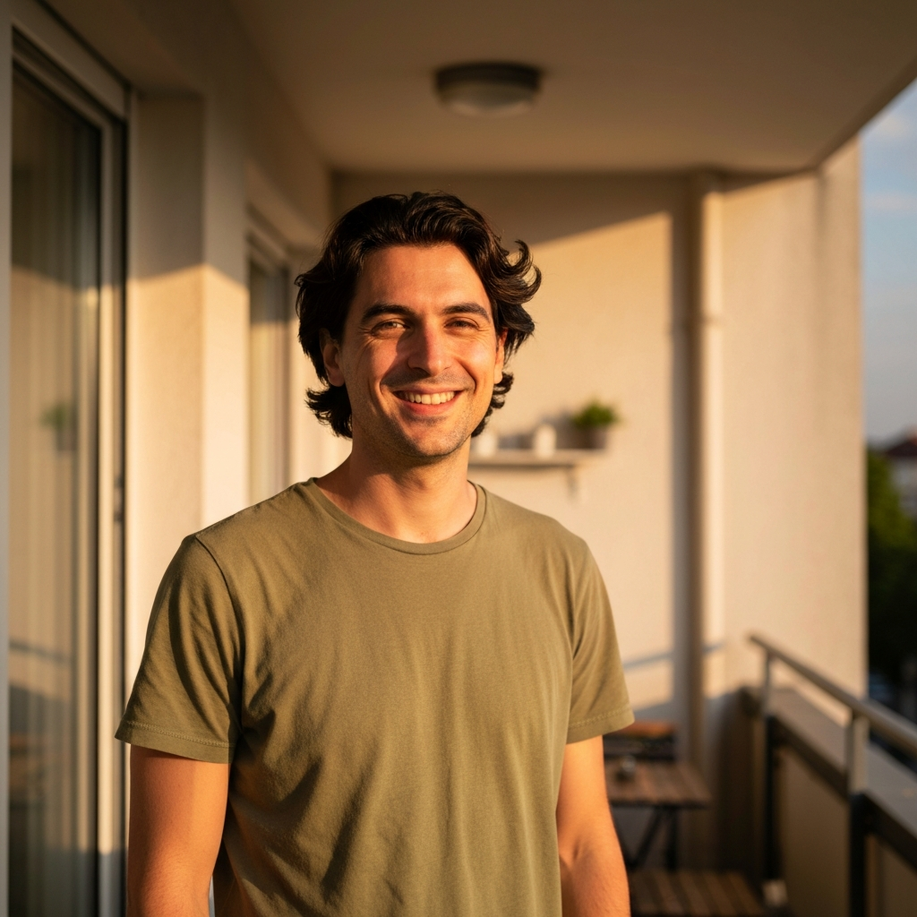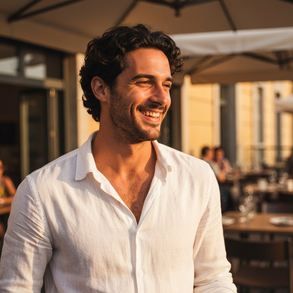 Dark hair, sharp eyes, calm energy. Fluent English with a slight European accent.