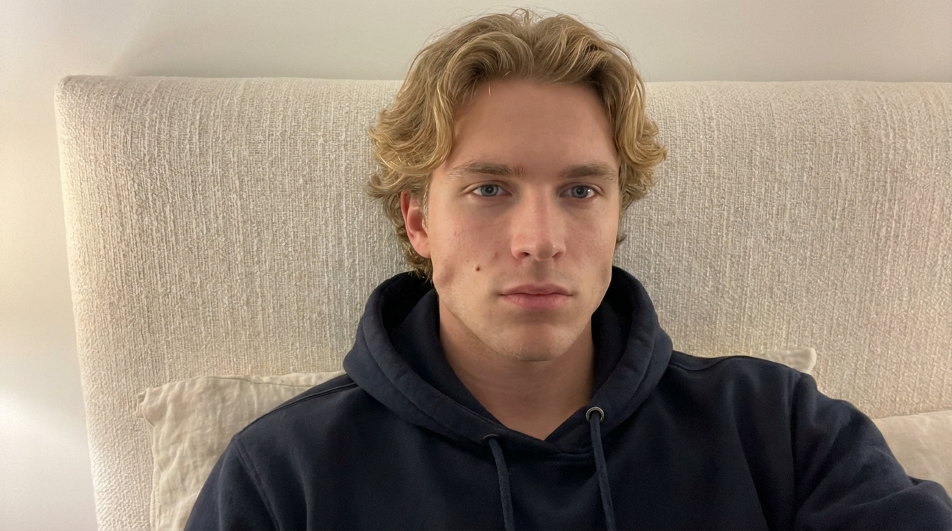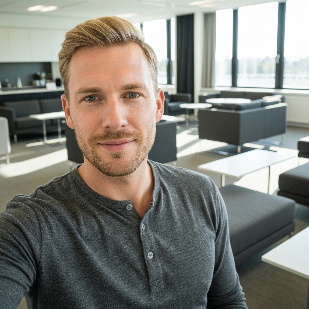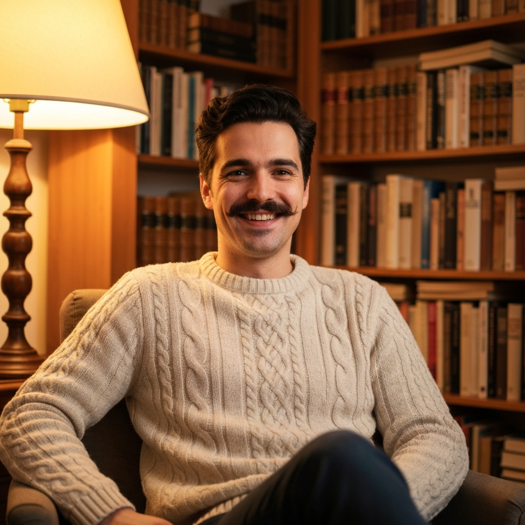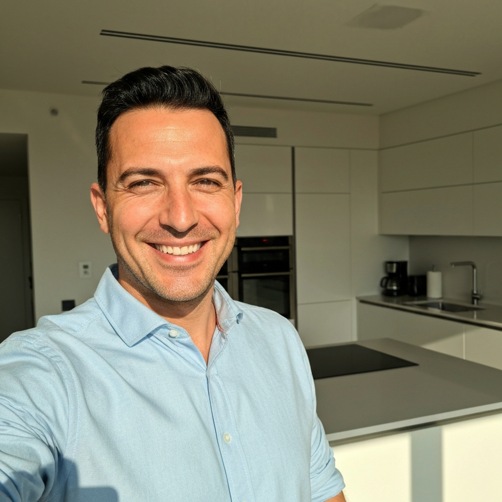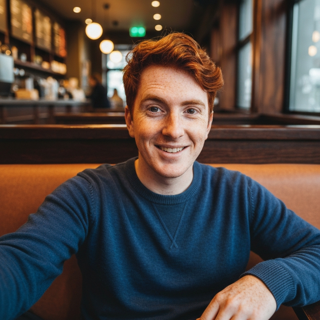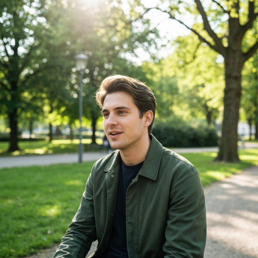 Dark hair, sharp eyes, calm energy. Fluent English with a slight European accent.