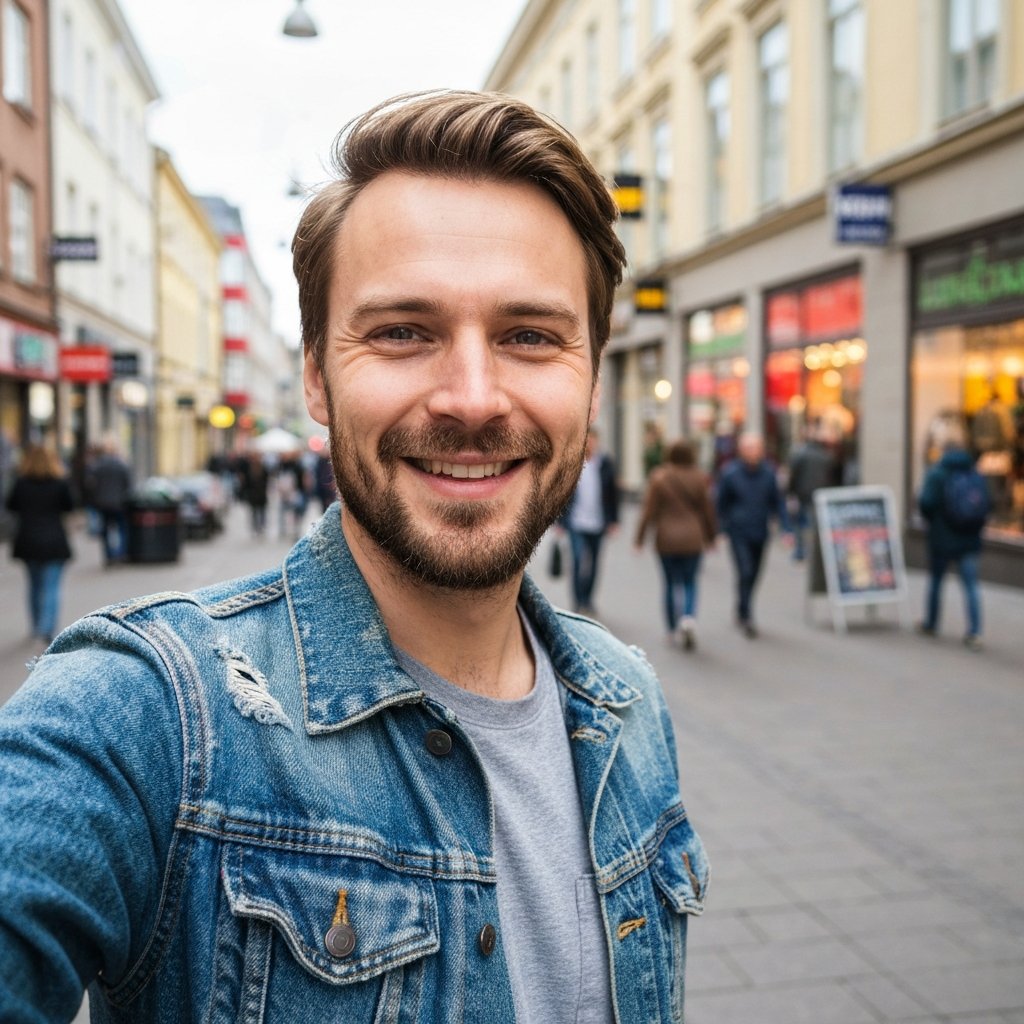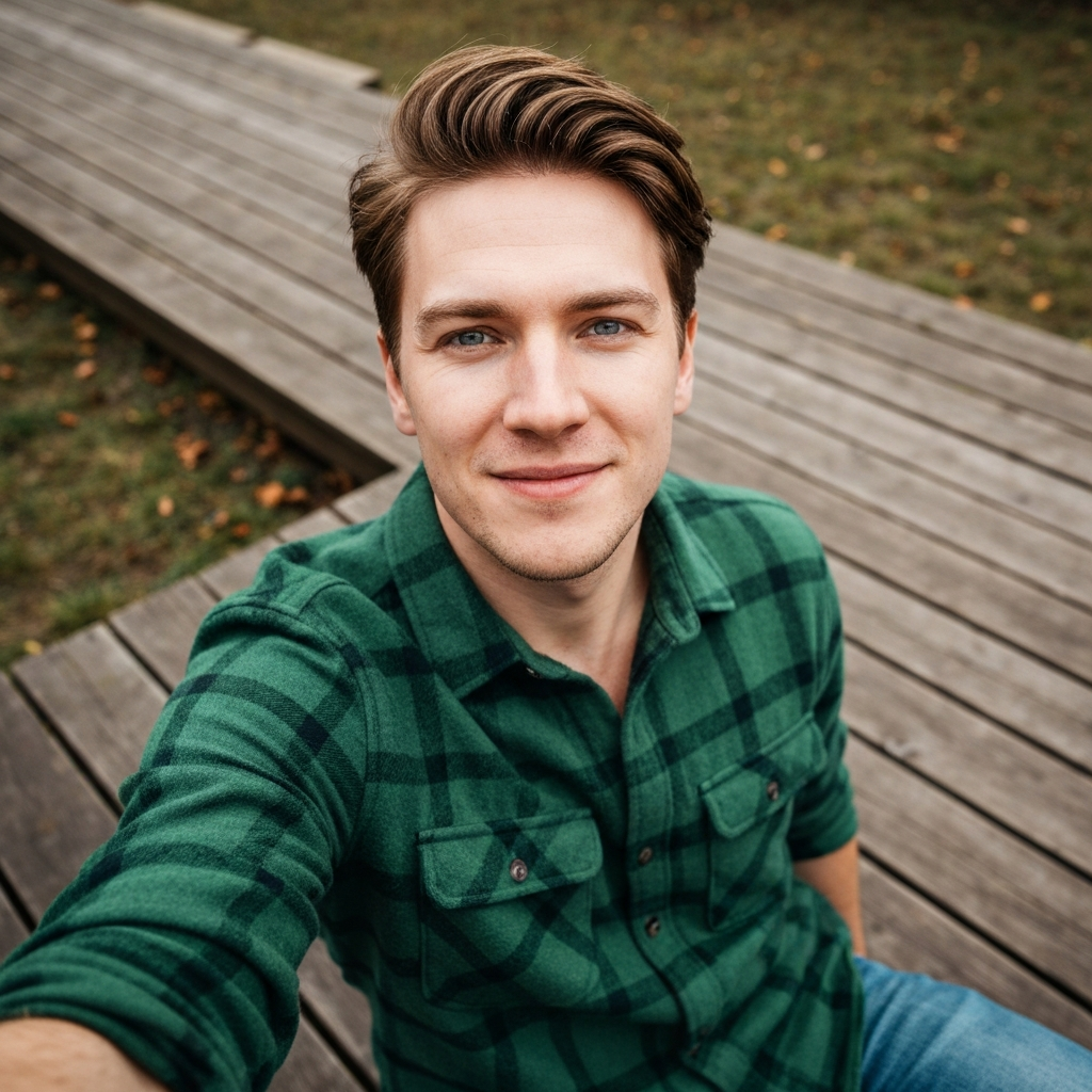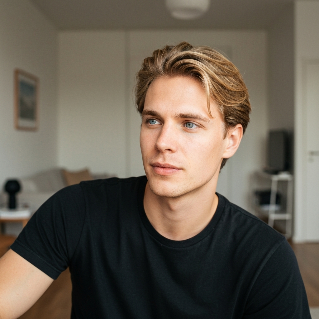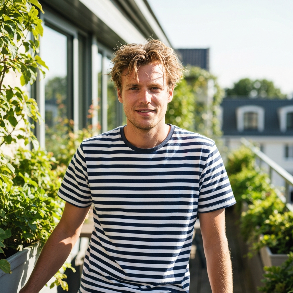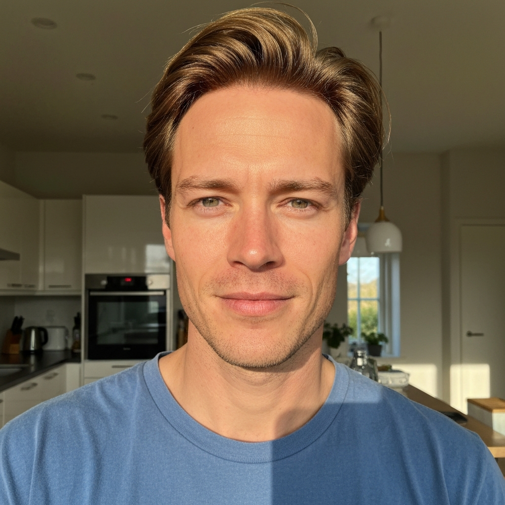 Dark hair, sharp eyes, calm energy. Fluent English with a slight European accent.