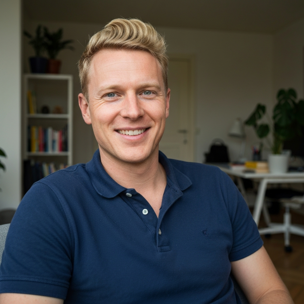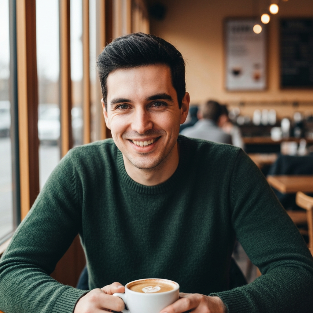 Dark hair, sharp eyes, calm energy. Fluent English with a slight European accent.